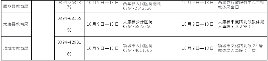 申请中等职业学校教师、中等职业学校实习指导教师、高级中学教师资格体检时间段为:10月9日—10月13日,体检地点:周口市中医院(周口市七一路西段人民公园对面,体检咨询电话:8279764);现场确认、提交材料时间为:10月9日-10月13日(上午9:00—11:30,下午15:00—17:00)。地点:周口市行政服务大厅二楼教育局窗口(七一路与大闸路交叉口西南角)